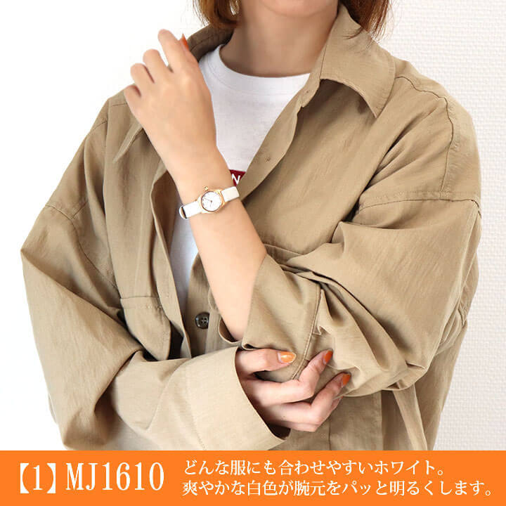 (1つの商品につきラッピングキットは1点です) 駆動方法クオーツ(電池)防水性能日常生活用強化防水(5気圧防水)表示方式アナログ表示ケースステンレスチールガラスミネラルガラスベルトレザー重量約14gサイズ(縦x横x厚さ)約25×21×7mm⇒当店のサイズの測り方を見る適合サイズ手首周り実寸約【13.0cm〜16.5】cmカラー一覧【1】MJ1610 【2】MJ1611付属品取扱説明書専用BOX送料について【送料無料商品の場合】北海道・沖縄は追加送料を頂戴致します。